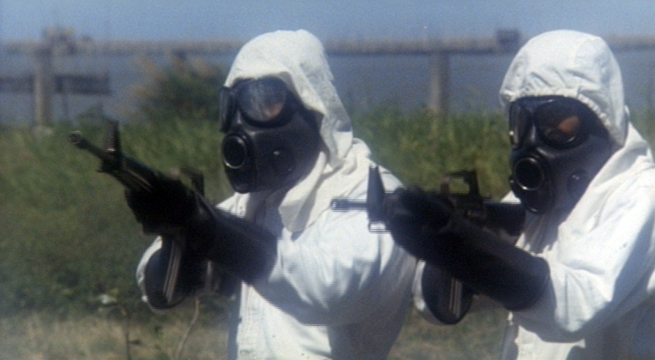 The film starts off on a tropical island, much like Zombie, although this is a different tropical island with more people. Some scientists are carting around a super deadly biological warfare canister. Does it get stolen by a terrorist? But of course! And naturally, the terrorist drops it and it cracks it open, because all biohazard material is transported in thin glass vials. You ever notice these canisters of biotoxins and plagues seem to pop open easier than your average bottle of aspirin? Someone should teach the military about the virtues of “To open, push down and twist.”