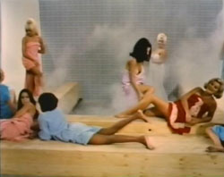 But I try to be positive, and so let me first mention some of the few good things Phenomenal and the Treasure of Tutankhamen delivers. That first scene was short but cool, with Phenomenal wearing that dress sock on his head and punching out a lot of guys. The music that accompanies that scene, and plays throughout, is far better than the movie in which it appears. Bruno Nicoli was one of the stalwarts of Italian film music, and he’s rarely not on top of his game, even if the movie for which he’s writing music leaves a lot to be desired. And although it’s too little too late, the finale is sort of fun, including a great little fight that stumbles into a women’s steam room — a scene for which there exist several stills featuring the women doing nudity. That was either done for some unseen “international” version, or purely as titillation for the promotional stills, because when the fight actually happens, the women all manage to keep their towels wrapped around them, since even a giant guy beating up a dude in black dungarees with a black toboggan pulled over his face isn’t enough to make a proper lady forget her modesty.