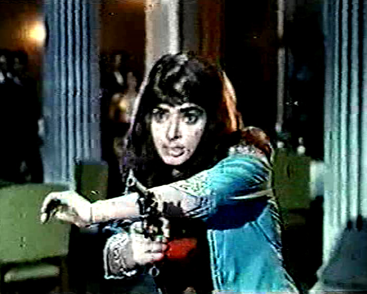 In addition to Rani, only her family’s faithful manservant, played by Don‘s Iftekhar, survives the massacre. As a result, he pledges to raise the child as his own. As the credit sequence will demonstrate, this will mostly involve him overseeing Rani as she undergoes the rigorous training in marksmanship and hand-to-hand combat that will enable her to become an effective weapon of vengeance against those who killed her loved ones. With the credits out of the way, Doss then wastes no time in cutting straight to the business at hand, with the adult Rani (Vijaya Lalitha) — sporting the first of a series of eye-nabbing outfits that will range from Mrs. Peel Euro-chic to what can only be described as psychedelic Annie Oakley garb — making her grand entrance in the lobby of a swank gambling resort called the Hotel Three Aces.