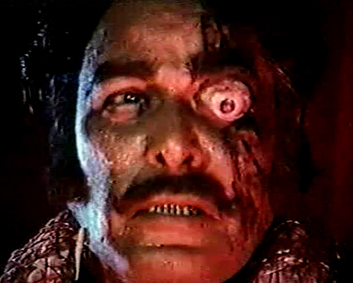 By this point, however, Rani need not look too hard anyway, because the villains, now well aware of her crusade, are simply coming to her. This they do initially by way of the hired help, which includes such colorful figures as a guy with a Freddy Krueger claw hand and a burly, hot pants wearing lesbian assassin — both of whom provide the opportunity for more camera hurling fight scenes, but ultimately fall prey to Rani’s righteous fists and superior ka-ra-te. Eventually the “kindly” politician, in a dramatic Phantom of the Opera-style reveal, is exposed as the Gross, Googly-Eyed Guy and exterminated, after which Skull Medallion Guy comes forward and successfully lures Rani into his trap. What follows is a series of sadistic tableau, with Skull Medallion stalking Rani through his lair with a whip (in a scene that was later mirrored in Sadhana’s Geetaa Mera Naam), then tying her to the back of his jeep and dragging her through the desert, and finally burying her up to her neck under the hot sun and filling her mouth with salt. Of course, this only qualifies him for the nastiest of treatment once Rani has gotten the upper hand, and she is happy to oblige by dousing him with gasoline and setting him on fire.