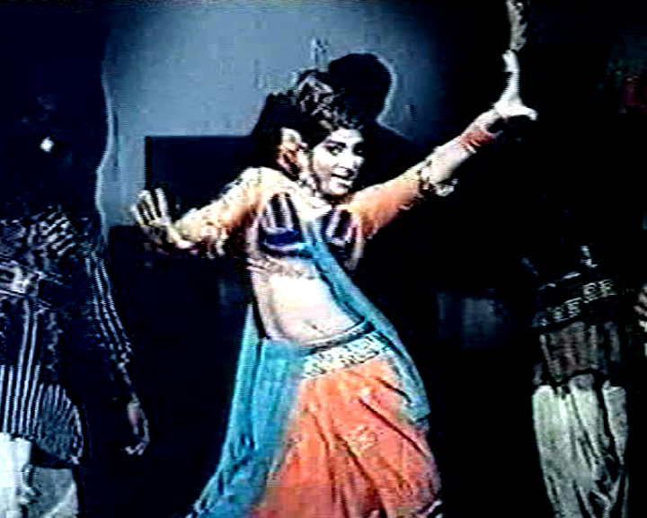 That said, I see some commonalities between these Telegu action films from the 70s and those of certain other regional cinemas whose loci lie considerably northward — by which I refer to those action films catering to the Punjabi and Pushto speaking audiences of Pakistan. In Pushto films like the notorious Haseena Atom Bomb, and Punjabi films like those starring one man industry Sultan Rahi, we see a reliance on revenge themes (frequently involving rape) that is strikingly similar to that seen in Telegu action films, along with an also similarly raunchy — especially in comparison to Bollywood films — approach to both choreographing and filming the female dancers. Also present in all three is a corresponding focus on hyped-up violence, lavishly grotesque villains, and shouty, oath-filled dialog, not to mention an absurdly profligate use of thunderclap sound effects and deliriously overstated camera moves to drive home already none-too-subtle plot points.