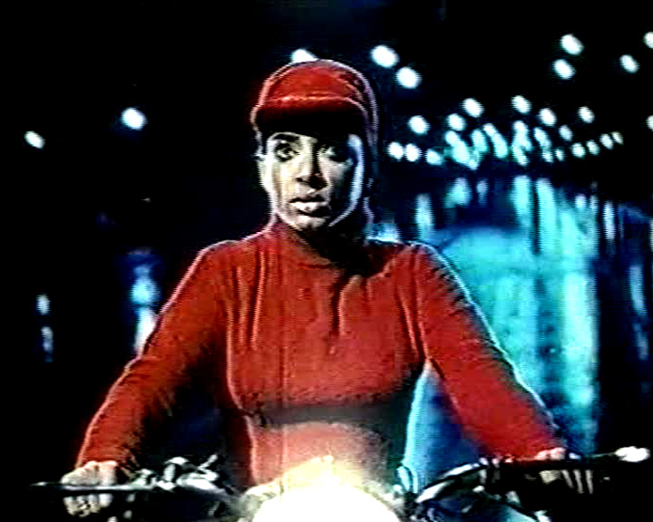 Our heroine then proceeds to the bank in question, where she foils the robbery by disguising herself in one of the henchmen’s uniforms — a bright red, sort of cardigan with a face-covering, ninja-like hood — then, posing as the getaway driver, delivering both the crooks and their loot to the waiting police. What then follows is a staple of Doss’s films, the obvious and quite terribly executed rear-projection motorcycle chase. I think the pinnacle of this appears in the later Doss film Rani aur Jaani, in which Aruna Irani and Jyothi Laxmi both take swings at each other and leap back and forth between their obviously completely stationary bikes as an anonymous stretch of highway spools out on the flickering screen behind them. With two-plus hours to fill with “100 percent action”, Rani Mera Naam actually gives us more than one of these, along with the chance to see an assortment of cast members doing their best to look like they are actually riding a motorcycle without any support from the surrounding ambiance.
