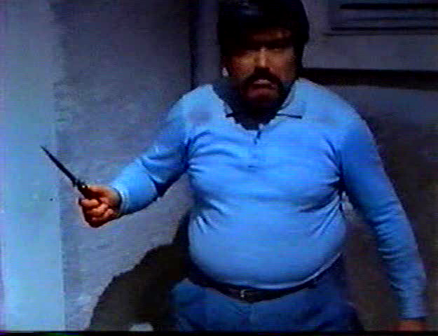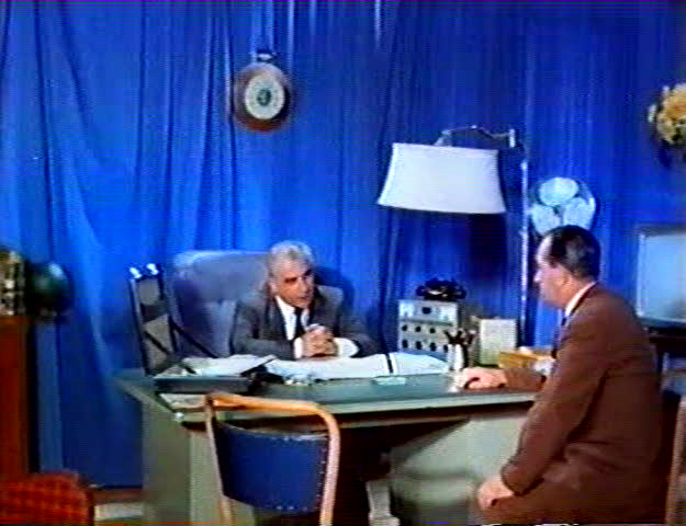 Yet, to Operation White Shark‘s credit, no attempt is made to hide any of these shortcomings. In fact, the film is almost obstinate in the way it rubs its own cheapness in the viewer’s face. We are, after all, tipped off from the very opening minutes as to just how dire things are. In that inaugural scene, we find ourselves in a small office occupied by our hero’s superior. True to Operation White Shark‘s reductive aesthetic, we’re never informed of what organization this fellow belong to, be it Interpol, the CIA, the FBI, or the Salvation Army. But, what’s most noteworthy is the office itself — or, rather, the “office” — which appears to have been hastily assembled from a random assortment of cast off furniture and knick-knacks, and, more importantly, is not enclosed within four walls, but instead surrounded by a floor length electric blue curtain with a wall clock droopily pinned to it. This curtain serves not only as a flag of impoverishment but also an invitation to speculation on the part of the viewer; it’s just so there that one can’t help but wonder what might be seen if one were able to pull it back: A bare sound stage? A Roman side street? The producer’s living room?