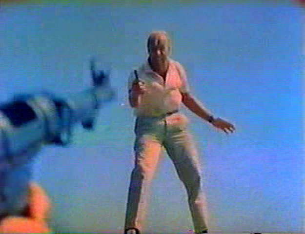 The Operation White Shark crew’s understandably limited access to the nuclear power facility put some obvious limits on the scope of the action they could film there, and Andrews’ rescue of the captured scientist ends up being somewhat anticlimactic as a result. It basically boils down to him creeping down some anonymous corridor, walking in a random door (probably an office that happened to be vacant at the moment), and then walking out again with the scientist in tow, after which the scientist is summarily shot dead by a guard who happens upon the scene. Oh, well. At least we have intermittent moments of Dana gunning down some of those female guards in the “H” emblazoned bodysuits, along with a few radiation suited minions, to break things up, as well as a nice, trailer-appropriate moment where he rides a crane across the length of the facility for no apparently pressing reason. Then there’s an odd bit where Andrews decides to take time out from his getaway to strangle a technician who was just minding his own business with a pair of robotic arms — I’m guessing because Ratti saw the robotic arms, was struck by the idea that it would be a cool thing to do, and was granted permission to do so by the facility managers.