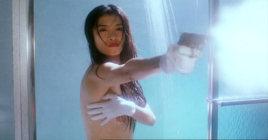Naked Killer demonstrates its good will toward its audience by making good on its title within scant minutes of its opening credits. And by that I mean that there is a killer, and that she is indeed, by all appearances, naked. This automatically makes Naked Killer better than approximately 80% of all other non-porn movies with the word “naked” in the title. After an opening shot of a mysterious woman hurrying down a rain slicked street bathed in atmospheric blue light, we see an armed man making his way through a darkened apartment and surprising a woman in the shower. “What are you doing in my apartment?”, he asks, effectively making our expectations do a quick somersault. Well, it turns out she’s there to kill him, which she does by handily disarming him, then hobbling him with his own workout equipment before crushing his skull and sealing the deal with a well placed bullet to the groin.