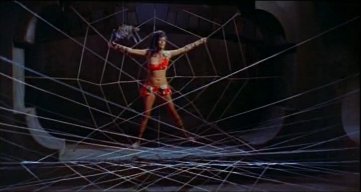 All of this calls to mind the design aesthetic of, not only the aforementioned “men’s adventure” magazines of the era, but also a wider tradition that includes the delightfully lurid — there’s that word again — covers of German Krimi novels, Italian gialli, and the macabre European photo comics that gave birth to the likes of the murderous antihero Killing. (One of the male models is even seen at one point wearing a skeleton body stocking reminiscent of that worn by both Killing and Kriminal.) This graphic sensibility carries over into the murders themselves once they begin, especially that of the model Kinojo, a faux exotic played by Wild Wild Planet’s Moa Tahi. Rick and Edith find the girl decorously tied up in a huge, room-sized spider’s web and clad only in an abbreviated two piece sarong, each of the web’s strands attached to a wall mounted bow and arrow that is poised to fire at the slightest tension. Meanwhile a huge mechanical spider, its claws coated in poison, inches ever closer to the terrified girl’s face. The whole scene is as reminiscent of an old “Spicy Adventures” pulp magazine cover as it is the sleeve of a Les Baxter exotica album come to life.