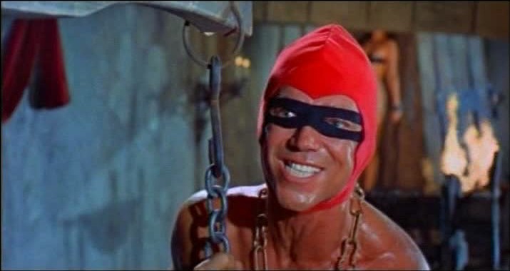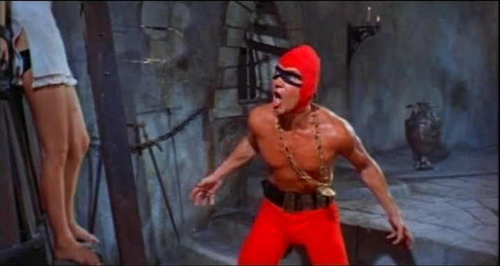As such, Anderson spends a lot of time admiring his muscled torso in the mirror, and also making some pretty hysterical speeches about mankind being inferior creatures who, had he not withdrawn from them, would have “corrupted the harmony” of his “perfect body”. Indeed, one has to wonder if the film is positing Anderson’s descent into madness as somehow the result of his retreat into narcissism, a turning of his back upon the world of action inhabited by two fisted ladies men like Rick that could only lead down the path to effeteness and perversion. In any case, once Anderson has made the full transformation into the Crimson Executioner, it is clear that he is meant to be every bit as ridiculous as he is frightening. Hargitay’s version of a maniacal grin borders on being outright goofy, and the red luchadore costume he wears as the Executioner does nothing to further dignify matters.
