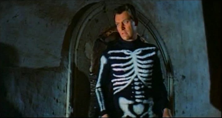 Perhaps due to Mansfield’s absence, it is Hargitay who gets the above-the-title billing in Bloody Pit of Horror. And I don’t think anyone can deny that he really gives it his all, sinking his teeth — and everything else — into his role with an almost disconcerting gusto. This is especially true once events transform his character into a homicidal maniac. You see, Anderson’s castle, as the story goes, had previously been the home of a notorious 17th Century pervert known as the Crimson Executioner, who, in a prologue reminiscent of Bava’s Black Sunday, is shown being confined for eternity inside his own Iron Maiden. Despite the leering enjoyment that the Executioner is shown taking in the torture of attractive young women, we are told that his was an obsession with purity — an obsession that Anderson apparently shares.