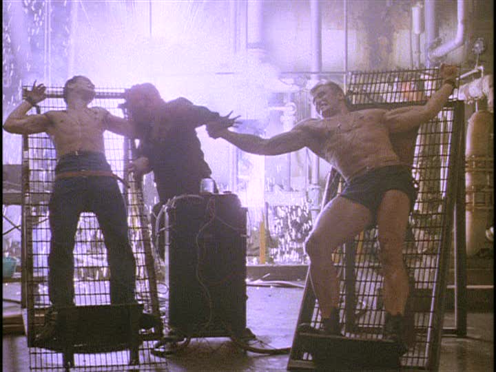 But none of this matters, really, because the film’s coup de grace, the line that makes it a gay action film through and through, comes when Dolph’s Japanese-style retreat is assaulted by Tagawa’s goons. Dolph, needless to say, is naked. When he and Brandon admit that this may indeed be their final stand, Brandon takes a loving look at Dolph’s genitals and remarks that he wants his buddy to know that if they die, the last thing he wants to be known for saying is that “you have the biggest dick I’ve ever seen on a man.” Which isn’t just a screamingly homoerotic thing to say; it’s also just plain awkward and weird. The biggest dick you’ve ever seen on a man? As opposed to…? Elephants and shit, I guess? This scene is followed up with the duo being strapped down—Brandon shirtless, Dolph in nothing but the aforementioned leather booty shorts—sprayed down, and tortured. If the screenwriters weren’t actively toying with the action film’s tendency toward homoeroticism, then I guess I just have to turn in my dandy card.