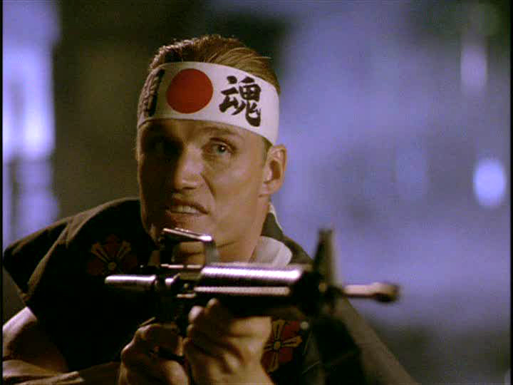 Dolph and his baggy, pleated, high-waisted khakis star as Sgt. Chris Kenner, the proverbial cop on the edge™ who plays by his own rules™. He’s also a Japanophile, which is communicated by having him wear a leather jacket with a dragon on the back. Also, even though he’s a huge blonde guy, he likes tea, because that’s hilarious when big dudes from one culture like dainty things from a different culture. When first we meet him, he seems to be taking it upon himself to dismantle the entire Asian criminal underworld of Los Angeles using the time honored method of busting into an underground club by himself with no warrant and just beating the shit out of anyone he can while occasionally firing off his gigantic gun. Later, when a same gang of thugs in astoundingly terrible shirts try to strong-arm the proprietor of Dolph’s favorite tea parlor, he protects her by starting a fight that basically demolishes her restaurant entirely.