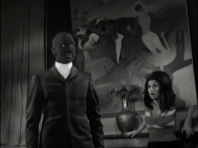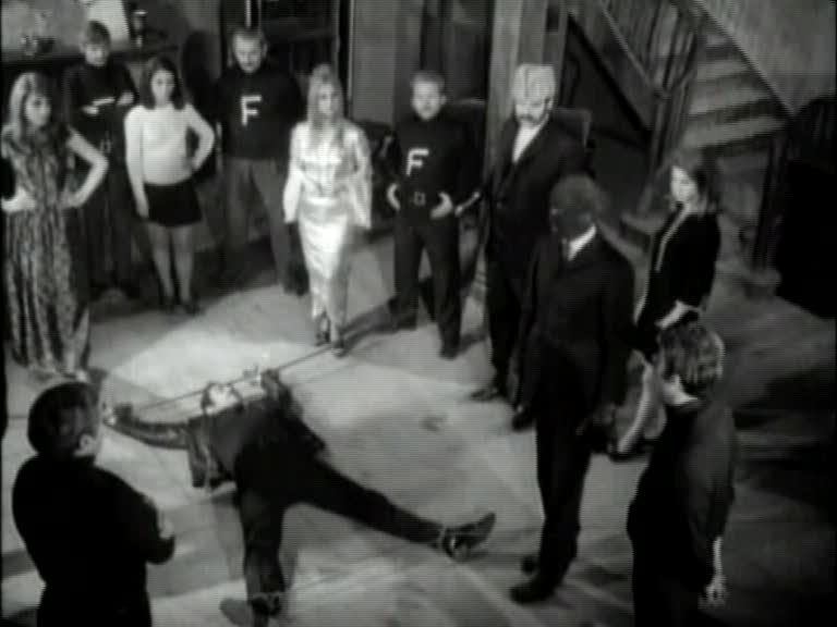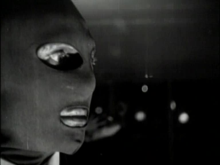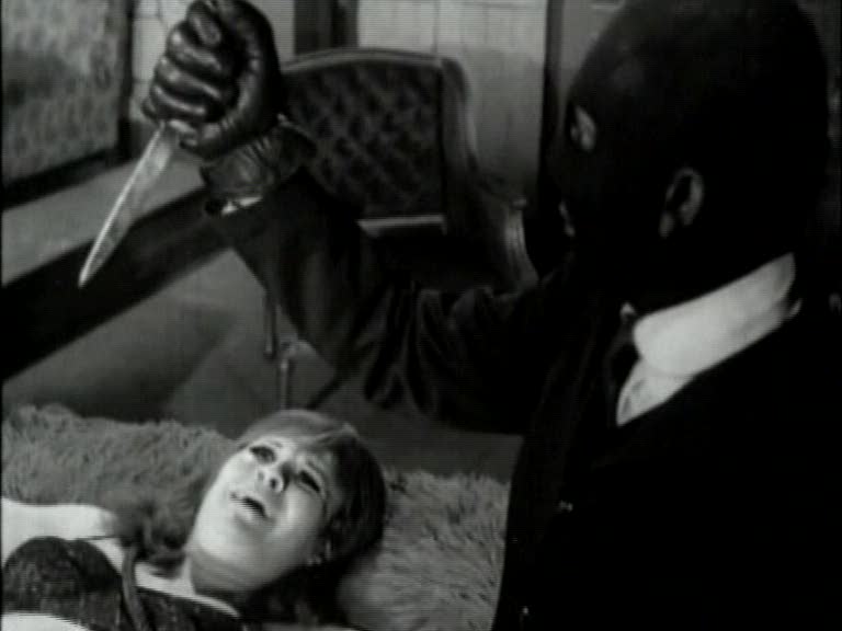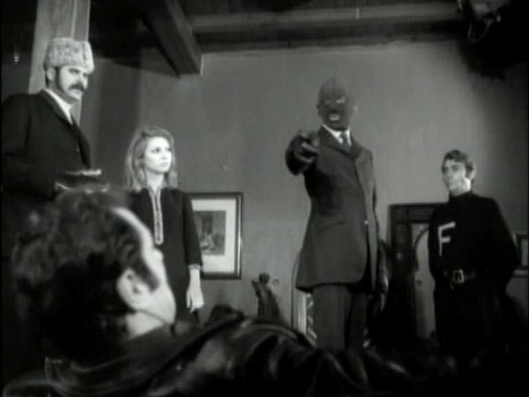 Fantomas himself would go through many incarnations in his lifetime, but it appears to me that the version on view in Iron Claw is based on the one seen in the 1960s series of Fantomas movies directed by Andre Hunebelle. Those films cast the actor Jean Marais in a double role as both Fantomas and as his arch enemy, the reporter Fandor–and in an interesting interpretation of that, Iron Claw fits Fantomas with a reporter alter ego. Iron Claw seems also to be going for Fantomas’ general look from those films, specifically the head-enveloping, skintight blue mask that obscures all of his features but his eyes. Only in Iron Claw‘s case that is accomplished by means of the actor wearing a black ski mask and having all of his visible features, including his ears, darkened with bootblack. Regardless of lineage, however, Iron Claw’s Fantomas is clearly a villain in the Kilink mode, slapping around women (and worse) while calling them “honey” and “baby”, and having no qualms about thinning his own HR pool by blowing away underperforming minions at the drop of a hat.