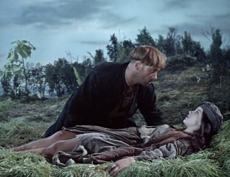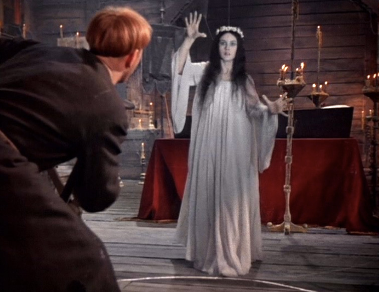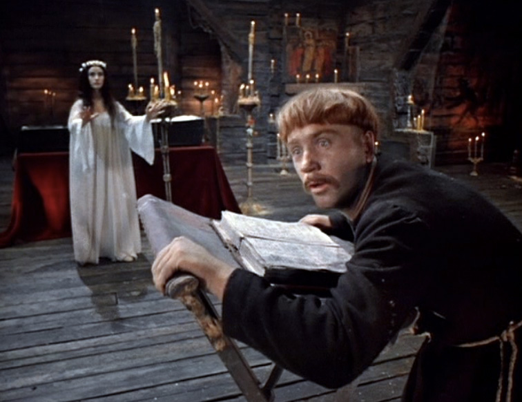 As he struggles late into the night to get comfortable, Khoma is approached by the crone, who at first he things is putting the movies on him. It soon becomes apparent even to the dim-witted Khoma that something else is afoot. Before he can react though, the cackling old woman has climbed onto his shoulders, cast a spell, and is forcing Khoma to carry her around — first like a horse, then like a broomstick as he and the witch take to the sky. Only by frantically chanting exorcisms and prayers is Khoma is able to force himself and his supernatural rider back to earth. I suppose she thought he would appreciate a fun night of flying around, but Khoma seems not to have enjoyed their late night frolic as much as the witch. He sets about beating her as soon as they land and she dismounts. But when the witch suddenly transforms into a beautiful young woman (Natalya Varley), Khoma is either confused or aghast, maybe both. Whatever the case, he runs off back to the monastery, leaving the young woman lying in the swamp.