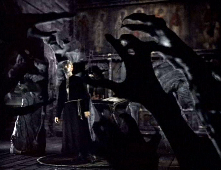 Viy also looks to the dawn of cinema for influences, specifically silent-era horror films like Haxan and F.W. Murnau’s Faust. In particular, the finale of Viy, which sees the dead witch’s fury toward Khoma culminate on their third night together with an all-assault by all the monsters and demons of Hell, looks almost exactly like something that could have been pulled from either of the aforementioned silent horror films, right down to the design and even the scurrying movement of the many devils who emerge from the walls to torment poor, stupid Khoma. Many in this grotesque menagerie of monsters look plucked right out of Haxan. For that matter, so does the midnight flight of the witch atop Khoma. For my money, there’s no finer imagery in horror film history than the surreal nightmares of the silent era, so Viy is wise to turn to them and unleash such vintage yet timelessly effective horrors in its tense and hair-raising final confrontation.