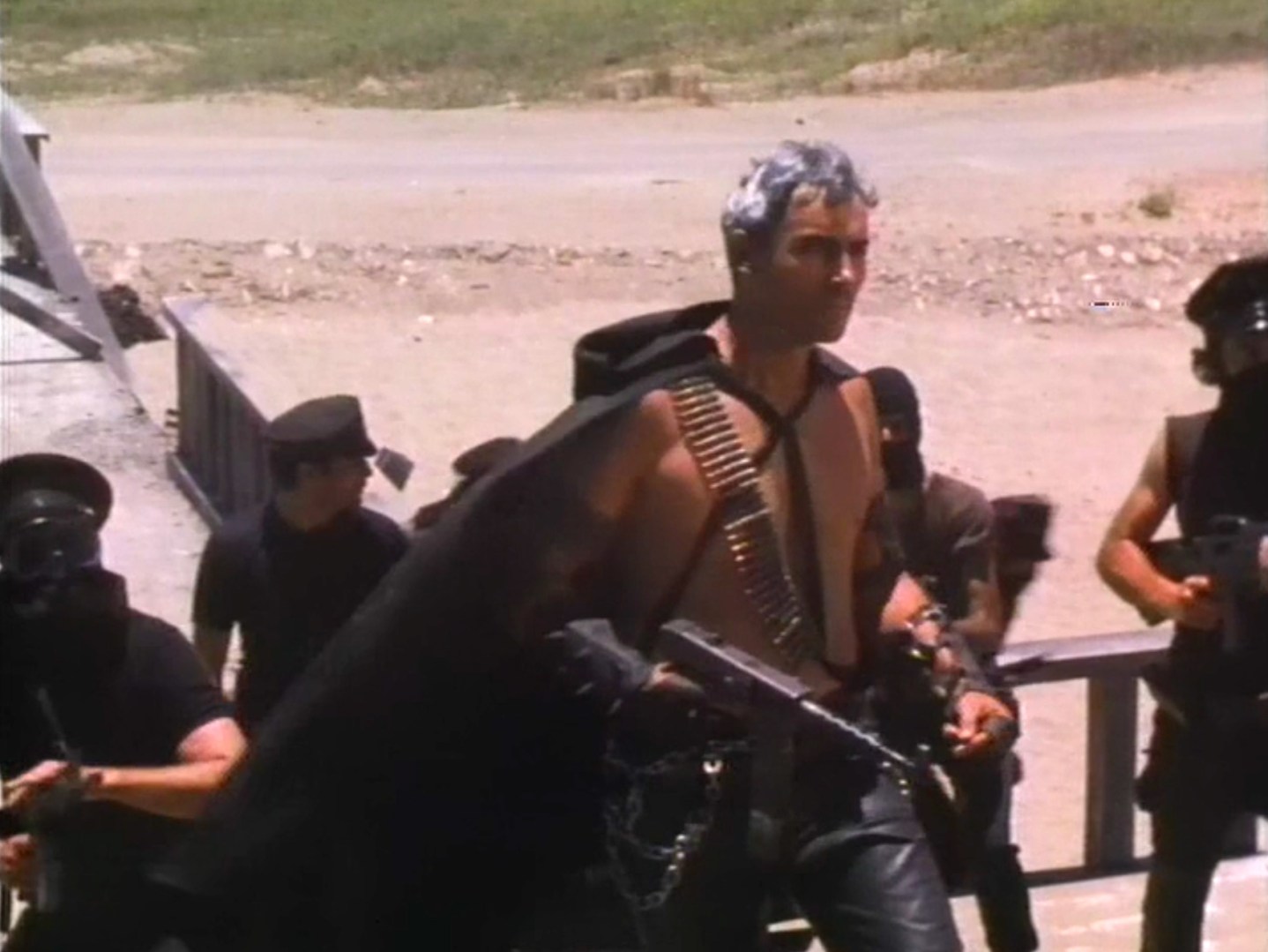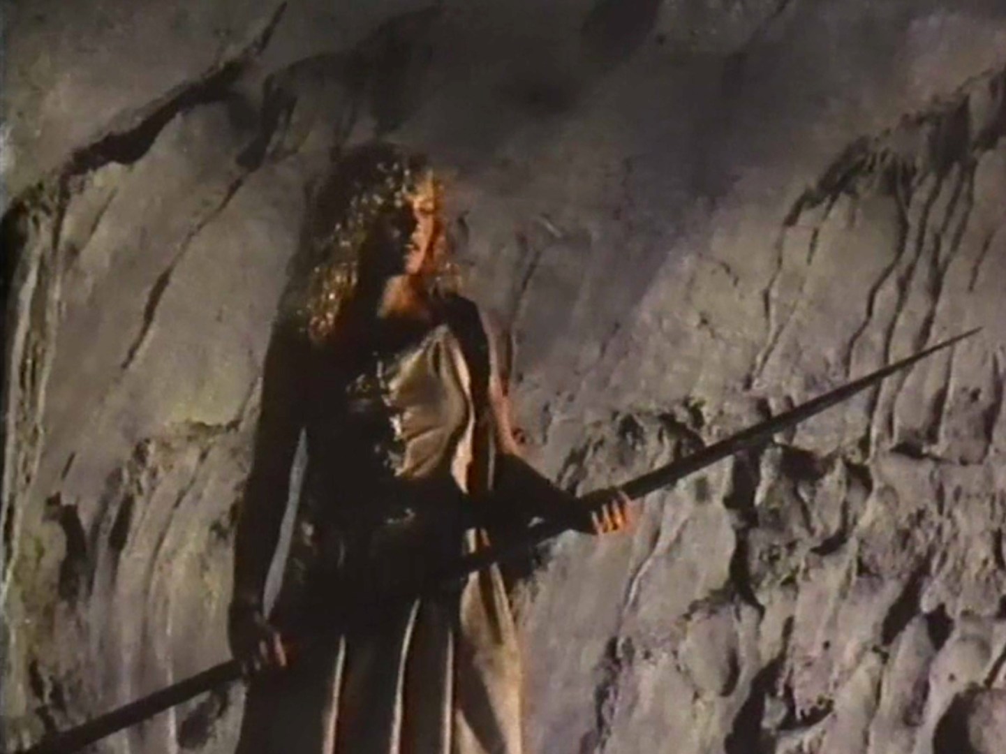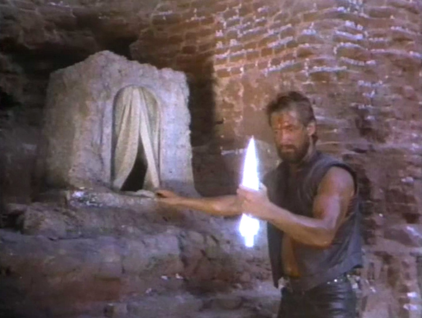 So it’s the future. A guy named Matthew (Richard Norton), is speeding around in the desert looking for the fabled Spear of Longinus, the weapon that pierced the side of Christ during his crucifixion. According to this film, the loosely-defined good guys of the future need the spear so they can travel back in time and prevent nuclear obliteration from ever having happened. Unfortunately, Matthew is pursued by the bad guys, lead by someone named Zaar (unfortunately not played by Robert Z’Dar), and where as Matthew has a cool car, awesome hair, and the same gun I think Richard Norton had last time he was a post-apocalyptic hero (that being in the film Equalizer 2000), Zaar has tanks and wears a gratuitous cape. They capture Matthew, bring him to within a stone’s throw of where he was going anyway, then let him escape. Then they chase Matthew to some crumbling temple where he finds the mythical spear with relative ease, only to have the full brunt of Zaar’s armored divisions brought down on his head.