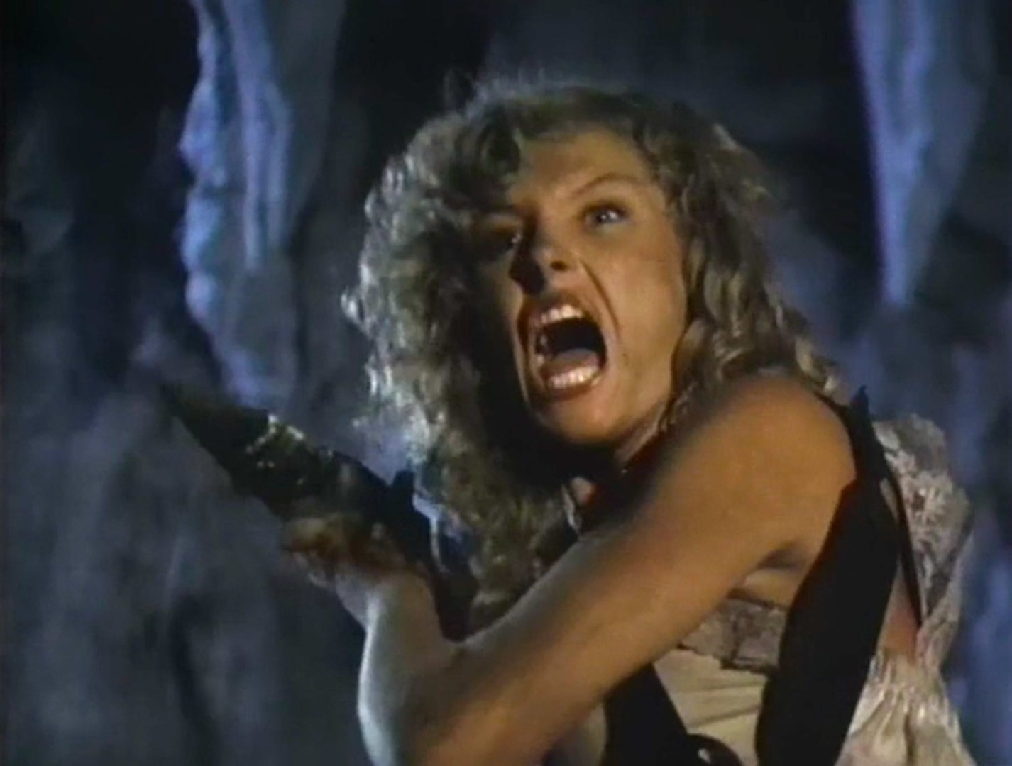 Michelle’s investigative archaeology is accompanied by that ’80s direct-to-video action film music that is so hard to explain yet so familiar as soon as you hear it. It’s a playful little number, and the sound isn’t straight synth nor is it a mimic of the piano, exactly. But in pretty much every ’80s direct-to-video action film, they used this style of theme for the “makin’ love” scene or the “just horsin’ around” scene. I’m a bit surprised that there is no Future Hunters soundtrack on Varese Sarabande, as “Soundtrack on Varese Sarabande” is the single most repeated phrase in the entire Psychotronic Video Guide. The world is a darker place for not having a CD quality recording of “Love Theme from Future Hunters.”