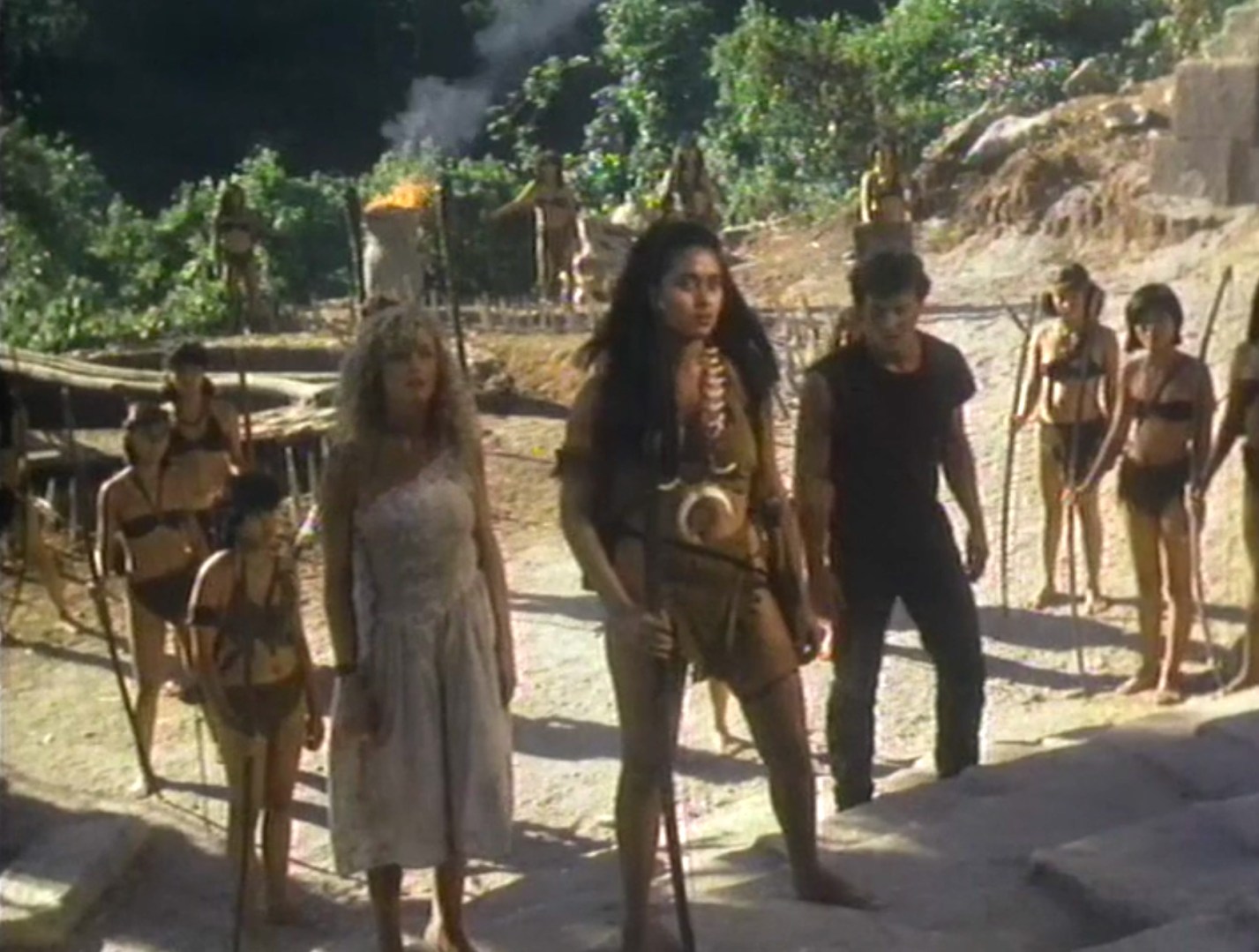 And even though I knew it wasn’t the case, the rest of the movie caused the same feeling of being assembled piecemeal, Godfrey Ho style. Things get no less logical when Michelle and T2 follow the trail to South Asia with a band of Nazis hot on their trail. There, in the jungles, they encounter a tribe of stone-age dwarfs who aid them in their quest to recover the shaft of the spear, which is in a cave guarded by an army of Amazons. In the end, an earthquake happens for no reason, foam rocks bounce harmlessly off people who show up bloody and dead in the next shot, and Michelle randomly holds up the spear, causing all the dwarfs to cheer and the film to end.