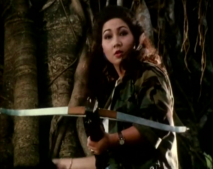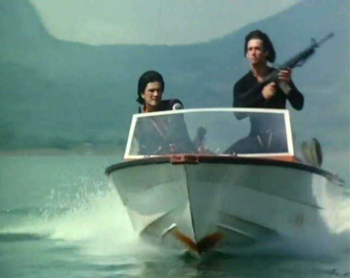 Along the way to this preordained conclusion, Goldson finds an ally in Tina (Dana Christina), the vengeful daughter of the kidnapped scientist. This allows for dual romantic pairings between Goldson and Tina on the one hand and Captain Johnny and Goldson’s partner Sylvia on the other, a circumstance that leaves the two male buddies so disbelieving of their own horndogging luck that they can’t help constantly elbowing and high fiving each other while giggling like high school boys. Tina is also desired by one of Goldson’s minions, Victor (Mark Sungkar), who, upon capturing her, is inspired to utter what is probably my favorite line in a film that has already shown itself to have a generous gift for idiosyncratically delivered verbal obscenity: “Your father will cry in hell when he sees me FUCKING you in front of everyone!” (I’m also a big fan of Goldson’s earnest and impassioned reading of the line, “You pig fucker!”)