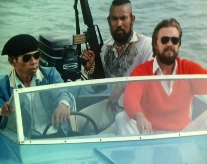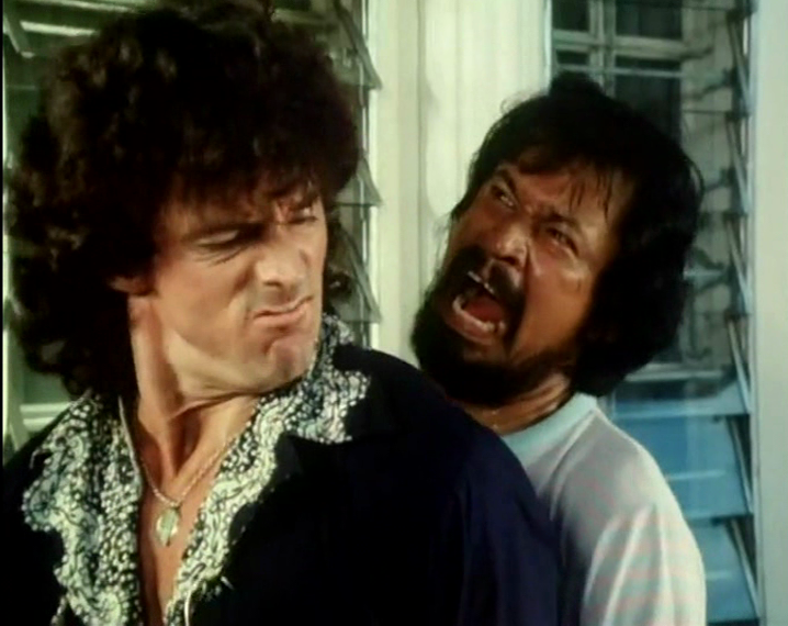 In The Stabilizer, O’Brian is Peter Goldson, a globetrotting FBI agent who arrives in Indonesia with his sexy lady partner Sylvia Nash (Gillie Beanz) on a very special assignment, an assignment that will involve no end of motorcycle stunts and vaguely defined martial artistry. Of course, it’s never enough in these movies to see our hero leap a hog off a balcony into a guy’s face or hurl himself from a helicopter; we also have to hear testimonials from the other characters about what a badass he is—and when that hero is portrayed by an actor as characterologically inert as Peter O’Brian, that may be doubly necessary. And so we have Goldson’s friend and Indonesian counterpart “Captain Johnny” (Harry Capri) on hand to provide what would otherwise be the work of an unseen, stentorian narrator. What we are dealing with here, he says, are “the world’s best criminals, who are COMPLETELY capable of upsetting the balance between good and evil in the world.” When the no doubt closely watched instruments that measure such a delicate equilibrium tip into the red, what is needed is ” a man with the guts and ability to restore that balance”. Ladies and gentlemen, meet Peter Goldson.