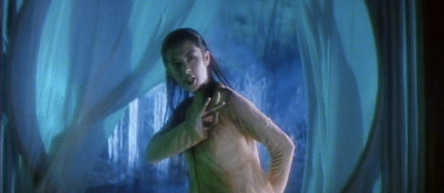 The blind priest, on the other hand, is a different type of corrupt religious leader. To him, battling “sin” is just a way to garner more attention and power for himself. It’s not about righteousness; it’s about career advancement. It’s about the rush he gets by forcing his will onto others. Tsui’s criticism of religion in these two characters is harsh but certainly not without sound foundation. Whether its nature is of a political or religious nature (if indeed there is any difference between the two), intolerance is, well, intolerable. It leads ultimately to destruction, alienation, and disaster. Things get bad when Green (Maggie Cheung) starts getting jealous of her sister’s romance. She was already a bit jealous of the success her sister had in adopting human form. Sou Ching pretty much has it down, while Green still has trouble walking and maintaining her human form. She begins doing little things to sabotage the relationship, culminating in Hsiu Xien discovering Sou Ching is a snake spirit. The shock of the revelation sends him into a coma which only a magic herb can cure. Sou Ching is emotionally destroyed, vowing to do everything she can to shed her spirit self and become a real human. Green, in turn, realizes how her pettiness has potentially destroyed two people, and agrees to seek out the magic herb. Unfortunately for the two sister, Fahai is waiting to trap them and send them back to their own realm.