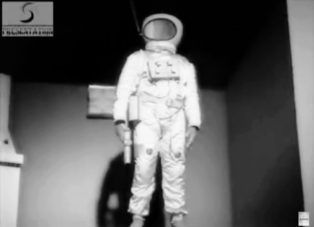 Now, up to this point, Wahan Ke Log has been careful to leave open the possibility that the alleged flying saucers are indeed a hoax. But it is with the hatching of Anil’s plan against Sarita’s dad that the film’s effects team are wakened from their slumber to produce a host of flying saucer effects that could credibly claim Plan 9 From Outer Space as their influence — with the major difference being that Wahan Ke Log’s UFOs conceivably might not even function as hub caps. The one expense that wasn’t spared was that of building a life-sized flying saucer for the space-suited Martians to step in and out of, which looks pretty good.