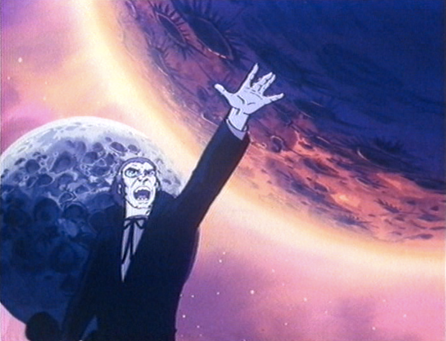 So now it all comes down to a showdown between Sark and some dudes who look like the good guys from TRON. This leads to the inevitable battle involving the hurling of light discs. And no, we’ve never seen anything like these good guys before, and there’s no explanation as to how they infiltrated the deepest inner sanctums of the Dark Emperor and Sark. And then, because Joseph Lai loves us so, down swoops Captain Harlock’s ship, the Arcadia, piloted by a Queen Emereldas rip-off named Sheila. She sounds like someone with a nasally British accent trying to speak with an American Southern accent. Sheila joins forces with the TRON dudes after proclaiming both them and the Dark Emperor her enemies, but whatever, man. Fuckin’ TRON dudes!