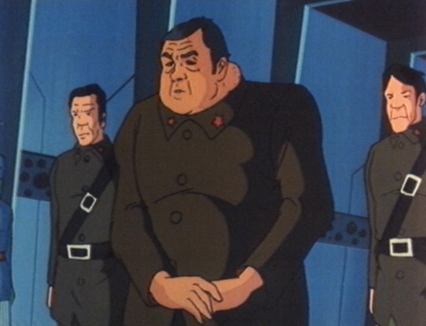Anyway, after Solar Mac 1 beats that other completely unexplained robot—as if you ever need an explanation for a fight involving a giant purple robot with a hook arm—we cut to some dude we’ve never seen before who is apparently the sole surviving commander of the Dark Overlord’s forces. This guy looks human and commands some blue guys in stupid hats. He tangles with Tiger SX-3, which is back to being piloted by the first crew we saw. Unfortunately, I don’t know what Tiger SX-3 looks like in this scene, because this commander’s forces are so lame that Tiger SX-3 doesn’t even have to get out of his spaceship to beat them. Meanwhile, Kim Il-sung double-crosses General Mon and decides that the war between the Alliance and the Dark Emperor has left the Earth ripe for the plucking. So even though all this guy has is an animated loop of the same tanks driving through the mountains, he launches his own assault on planet Earth, which consists of driving his tanks through a tunnel and never being heard from again.