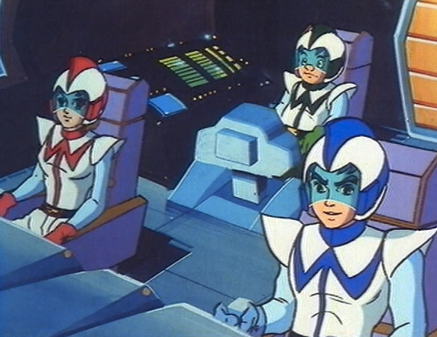 Then it’s back to that battle between the Galactica guys and the fleet of Yamatos, and I still have no idea who these people are. Oh, OK, the Galactica guys are the humans I think, because they’re not blue and Tiger SX-3 shows up to smash the Yamato ships before taking on…I think that’s General Tim, but maybe it’s Saga. Whatever the case, he sends out “Super Shark with the Iron Ball” and “Super Lynx with the Thunder Axe,” two more giant robots armed with a ball and chain and an axe. You would think that if you had super giant transforming robot technology, you could come up with a more useful outer space weapon than a medieval axe and mace. But then, a giant robot flying through space while swinging around a big-ass axe looks pretty cool. Oh yeah, at this point Tiger SX-3 becomes an entirely different robot. Now he’s a Transformer. I forgot which one. The one that turns into a fire truck, I think. Also, he’s being piloted by a different crew than the last one we saw a couple seconds ago.