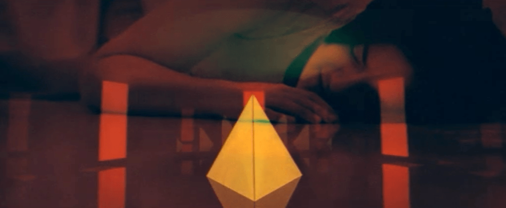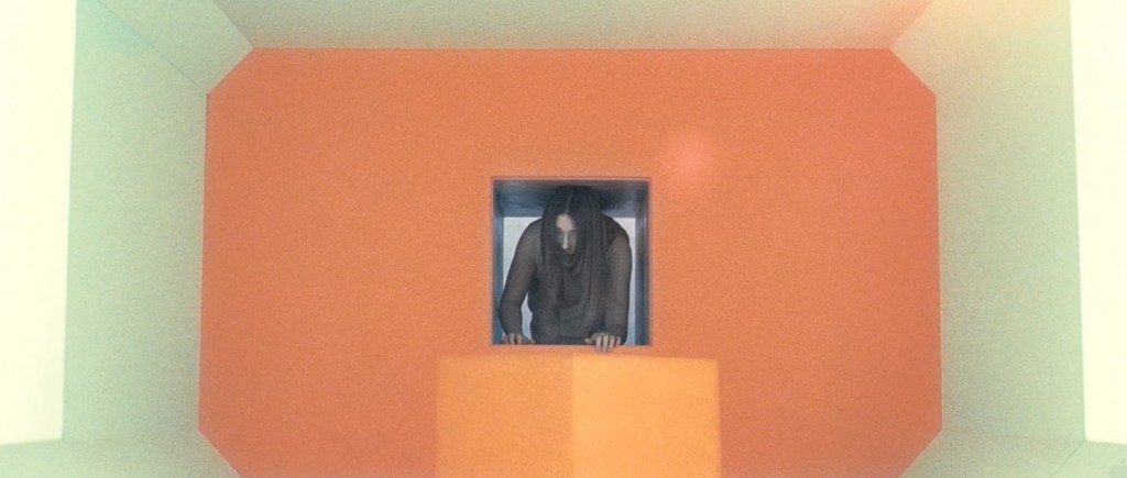 Just as the disappointingly average outside world greets us as we come down off the stylistic high of the scenes inside Arboria, so too does the surreal meditative science fiction film give way to the intrusion of what is basically a slasher film. It seems at first a clumsy transformation of the film, but it’s reflective of everything we’ve experienced up to this point; the real world as a stand-in for Arboria’s inability to transcend the real world, to only achieve the illusion of success by sealing himself (and Elana) away like a hermit seeking enlightenment by hiding in a cave. The tonal and visual shift is jarring, all the pulsating pastels and monotone speech affections and languid pacing being abruptly traded in for a scrubby field, a knife-wielding maniac, and a “final girl” running through the woods at night. Our trip has ended, and it turns out one of our fellow acid heads didn’t come out of it unscathed.