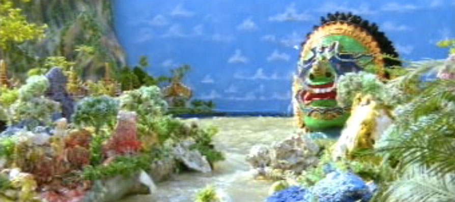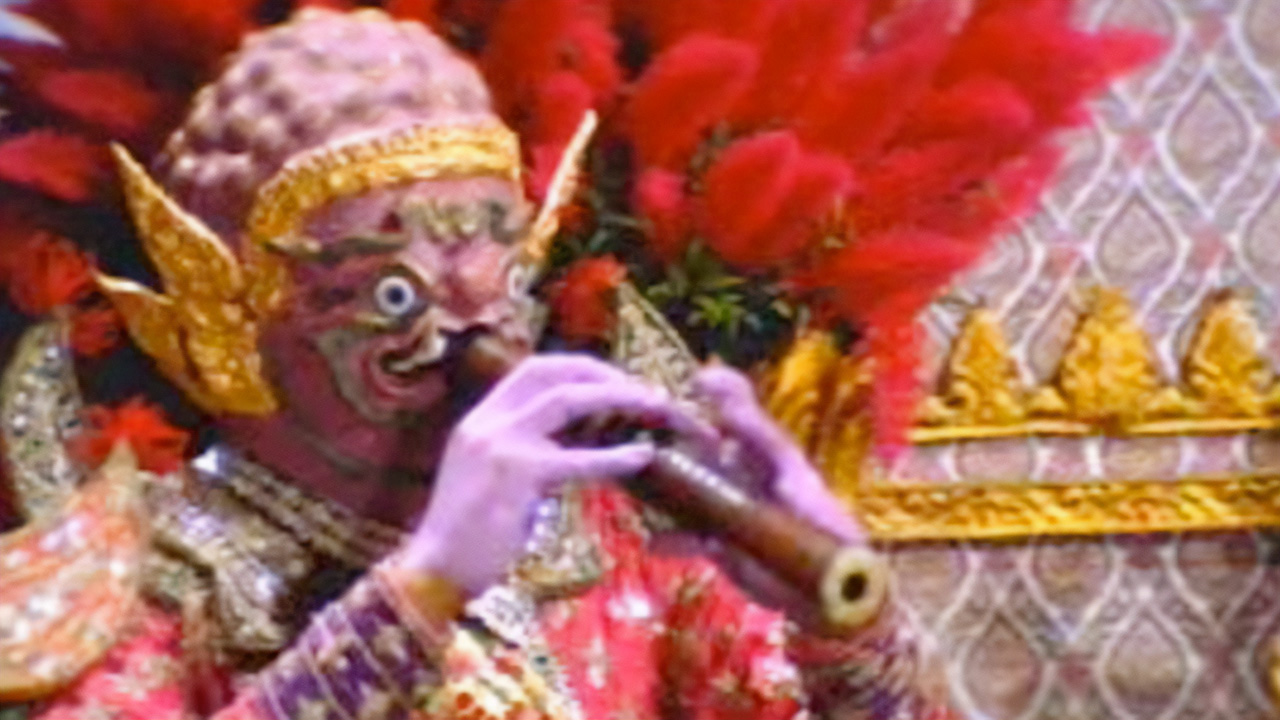 Sands draws heavily from both nang and khon traditions. Although the characters are not silent, they move in a very khon style and boast the same ornate masks and costumes. They work remarkably well on film, and it’s easy to buy into them even though one might think the trappings of stage theater would seem out of place in the context of actual location filming. But Sands’ work is always so surreal and screwy anyway that it’s easy to go with it, and suddenly all these lavishly dressed creatures and pink dragon-horse puppets make perfect sense.