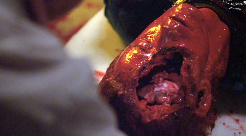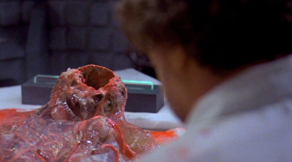 Colby is supposed to decide what to do with the now seemingly docile beastie, and what he decides to do is put off his decision in favor of dinner. While everyone is busy eating sponge cake with jam, the creature does its best to get some attention by killing some surfer dude (Michael Bowen). It turns out the guy is only mostly dead. It melts his face and skull and starts transforming his DNA into something hideous and covered in blood and mucous. Resident mad scientist Dr. Gordon Hauser (Linden Chiles) doesn’t think this justifies killing what he keeps vaguely referring to as this remarkable life form. Another resident mad scientist, Dr. Cal Timbergen (Fox Harris), is overjoyed to have this gooey new specimen to poke at while he chain smokes and jabs syringes into his own belly.